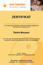 Nach einer erfolgreich abgelegten mündlichen und praktischen Prüfung wird dir das Zertifikat 'Tantra Masseur' von GAY-TANTRA mit Armin Heining verliehen. Dieses Zertifikat, mit dem du aktiv deine Qualifikationen auf deiner Webseite, den sozialen Netzwerken und anderen Profilen bewerben darfst, zeigt die Qualität deiner Tantra-Massage-Fähigkeiten an und hebt dich aus der Masse von Tantramasseuren hervor.